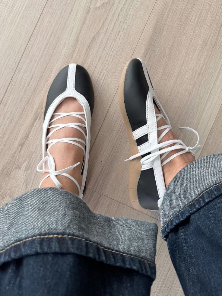 Crafted from soft leather, this black and white women’s Taekwondo Mei Ballet combines heritage design and modern aesthetics. The front toe area pulls design inspiration from the adidas Y-3 model, with a cloud white Y-type overlay that sits on top of the core black upper. Three white stripes are on the side panels, while black adidas branding sits on the white heel.  A durable gum rubber outsole equates to comfortable traction. The shoes lace up directly on the forefoot without a tongue and can be tied around the ankle if desired to resemble ballet pointe shoes.