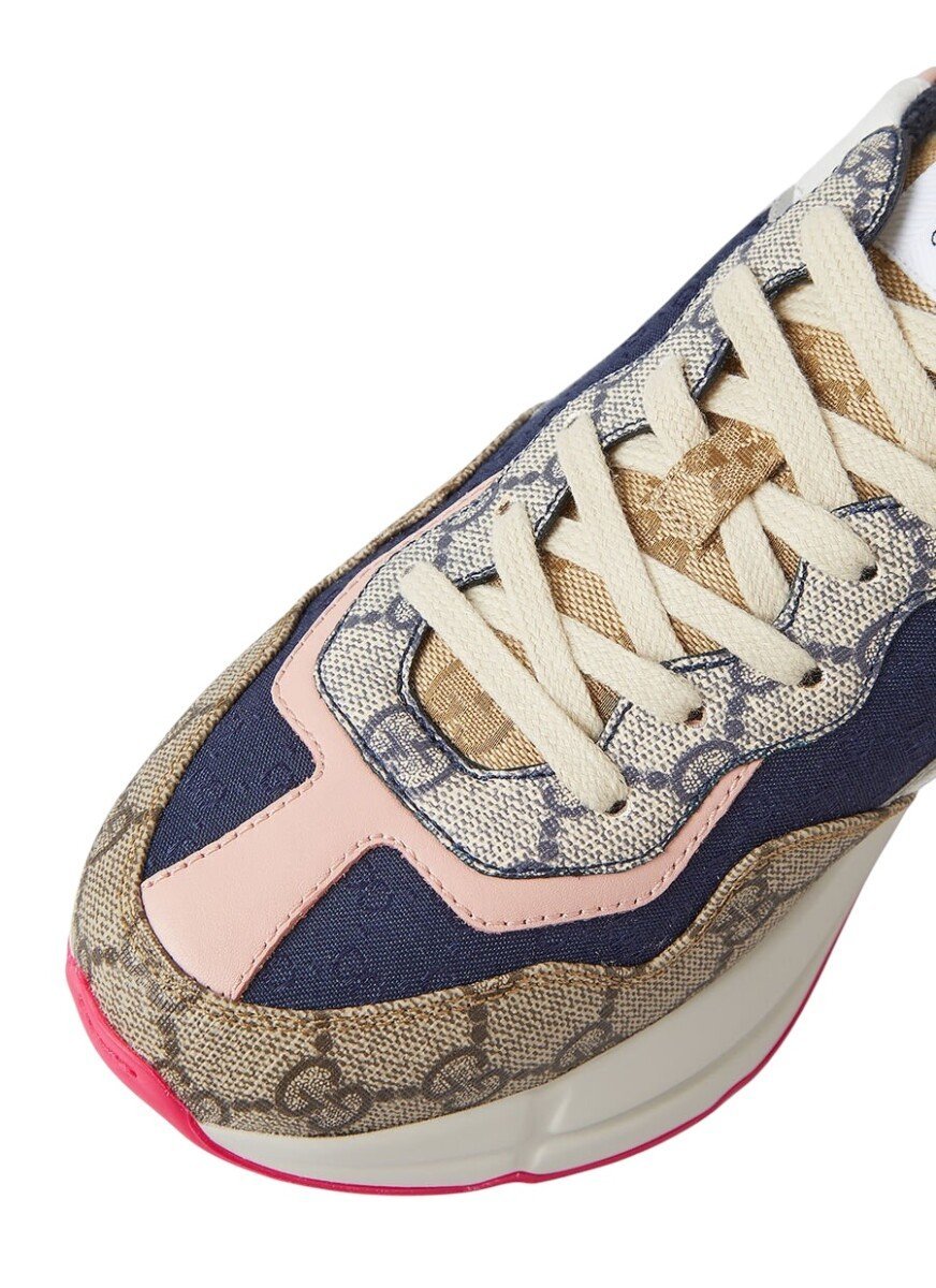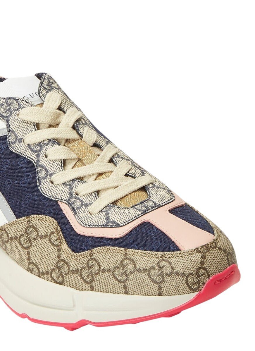 Constructed with a luxurious leather upper and a chunky sole that commands presence, the Gucci Rhyton Beige Ebony melds the worlds of comfort and high fashion. It’s a sneaker that doesn’t compromise on brand identity, with the signature Gucci stripe subtly gracing the shoe’s profile. The substantial build and retro vibes are balanced with refined touches, such as the discreet branding on the tongue and heel.