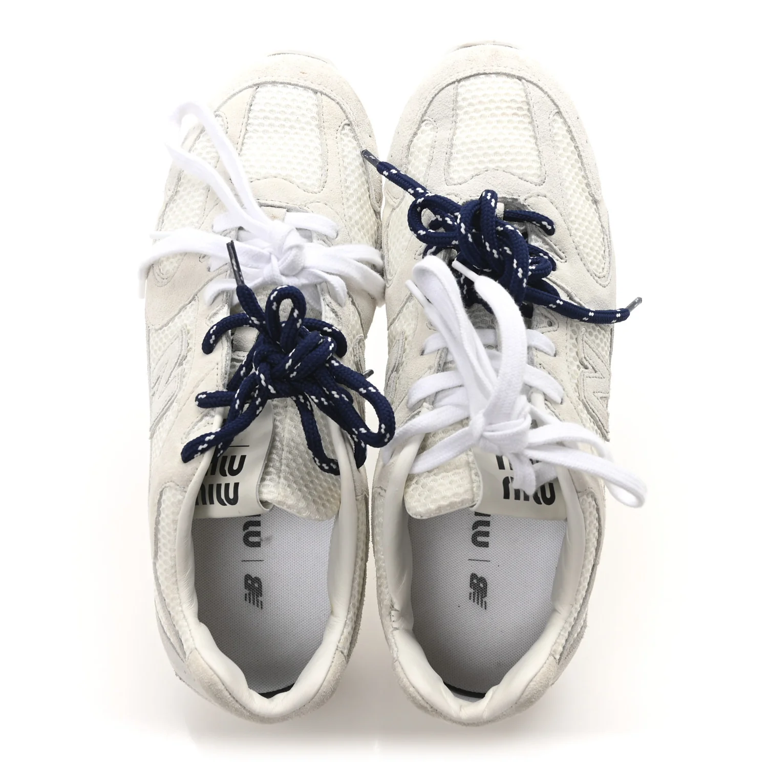 This exclusive style is the result of a collaboration between Miu Miu and New Balance. Miu Miu completely renews the structure, making it ultra-light, and plays with the materials. The logo completes the design with its iconic signature.